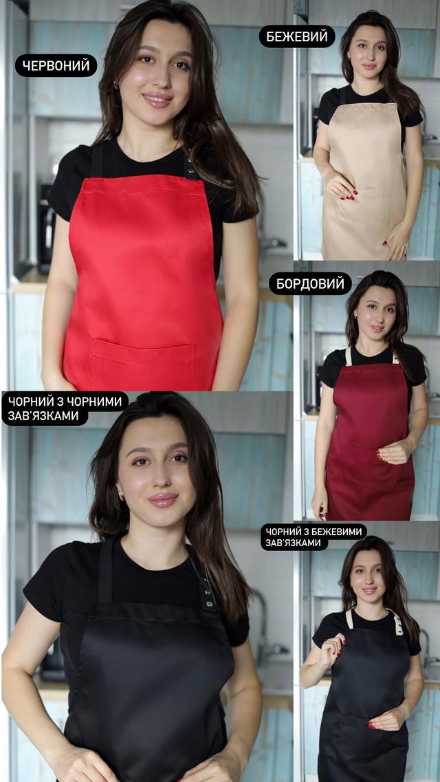 - Особливості: карман, розмір фартуха регулюється завдяки застібкам на шиї, підходить як для чоловіків, так і для жінок